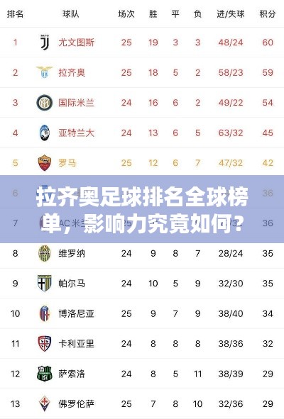 在足球世界里,球队的实力与排名往往受到诸多因素的影响,包括球员的技术水平、战术体系、教练团队的能力以及俱乐部的经济状况等,而今天我们要探讨的,是意甲豪门球队——拉齐奥的足球世界排名,这支球队以其独特的魅力与实力,在全球范围内赢得了众多球迷的喜爱。